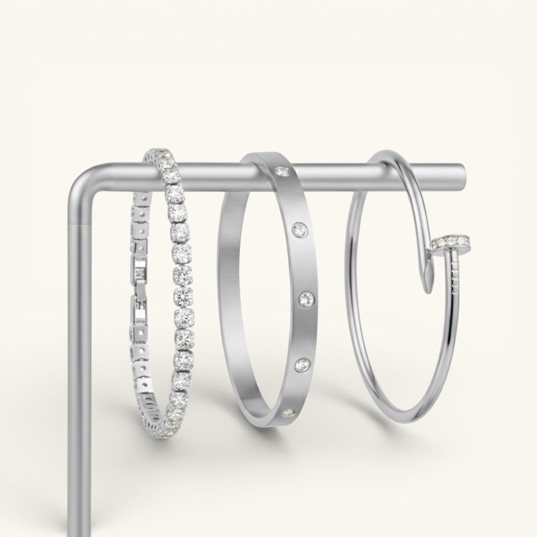 • Elegance Nail Bracelet: A bold and modern statement piece with a sleek nail-inspired design (one size).